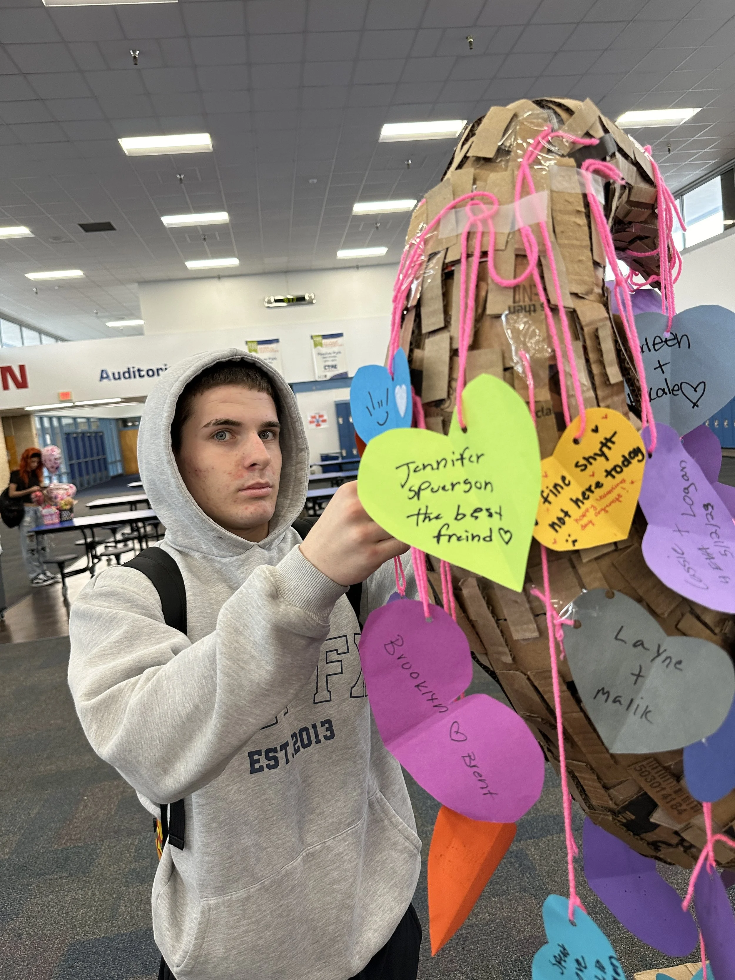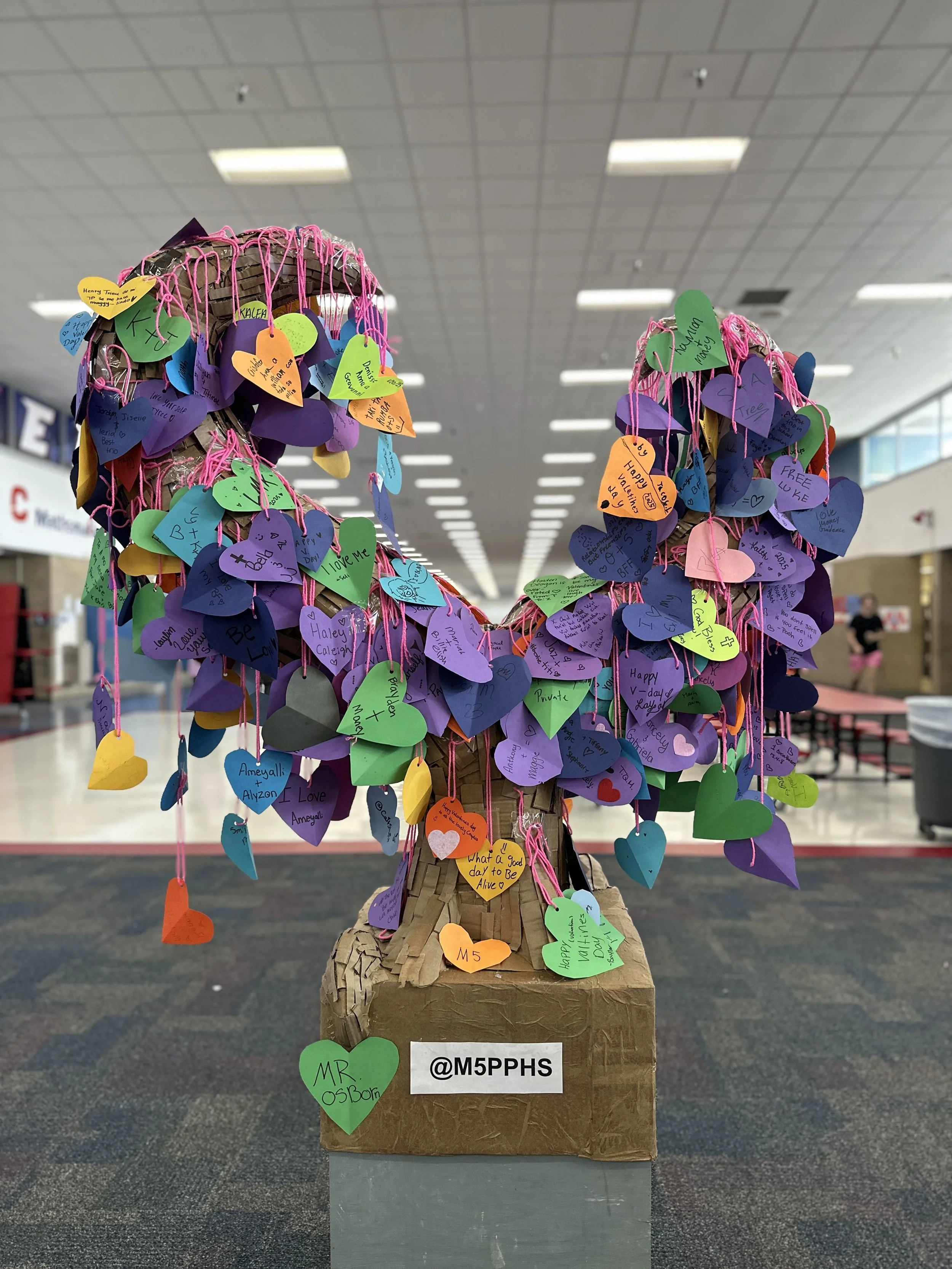 For Valentine's Day, my students constructed a heart-shaped tree from recycled cardboard and installed it in the center of our school's main walkway — the heart of our campus. We cut paper hearts and invited the whole school to fill them: a kind word, a shout-out, a small expression of love. As the day moved around it, the tree grew. By the final bell, it was something none of us had planned for — a living record of our community, blossoming with color and with care.