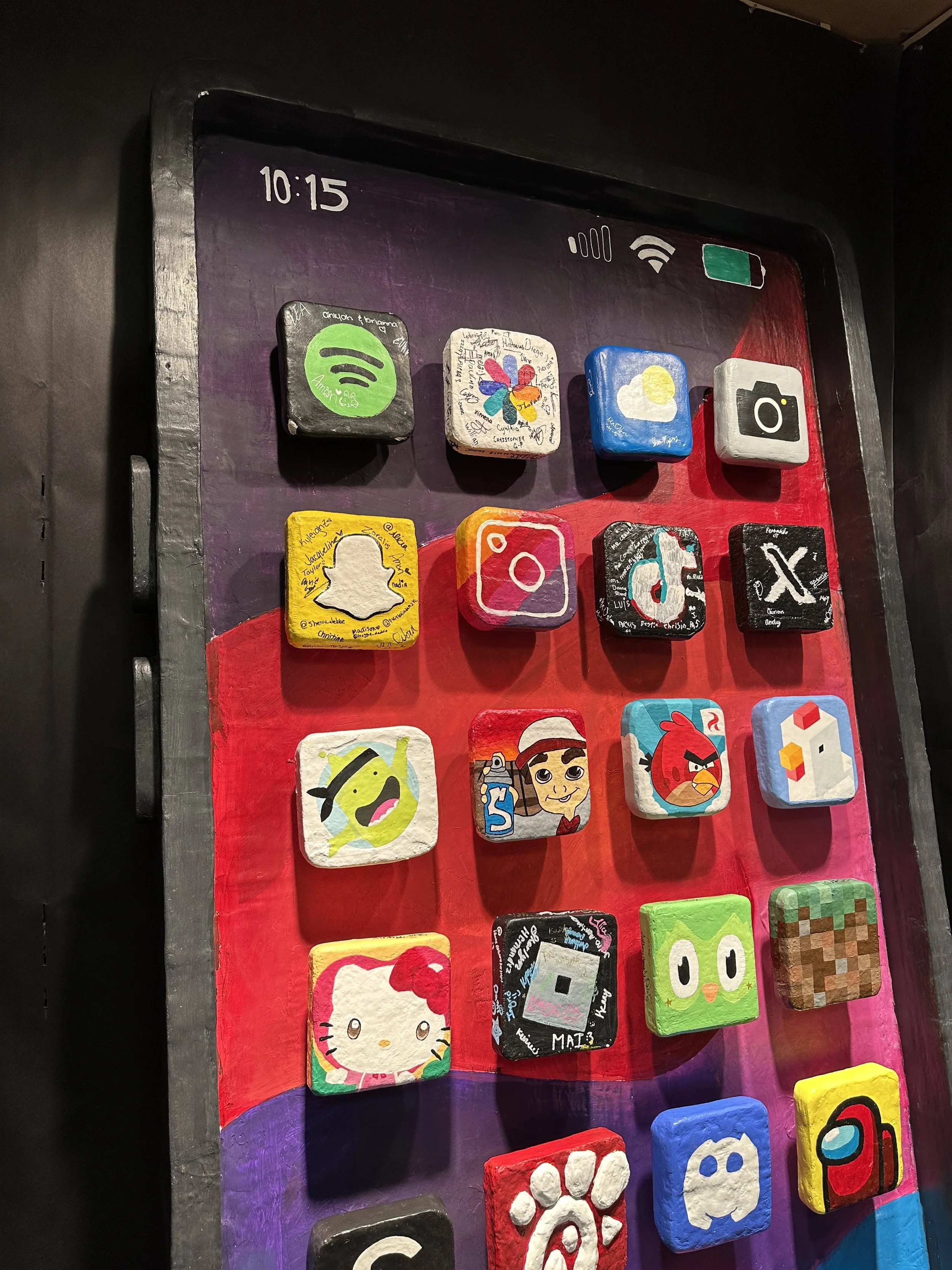 Then we needed somewhere to put them. So we built a proportional iPhone, eight feet tall, standing in the middle of the classroom, and filled it with the icons my students had made by hand.