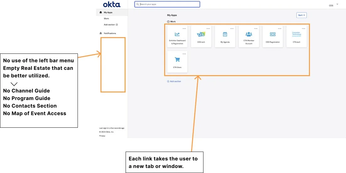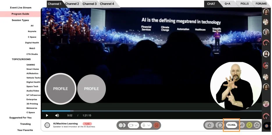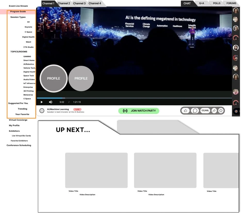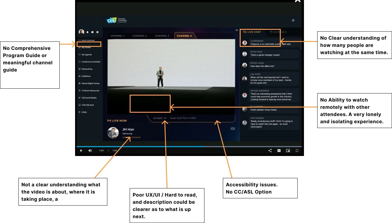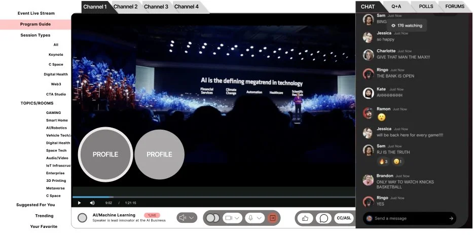 CES2024 is already a strong trade show platform, but there's potential to improve user engagement and navigation. The current setup could be better tailored for remote attendees, people with accessibility needs, and those looking for more interactive connections with other viewers.