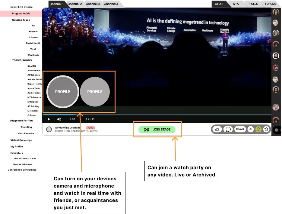 Users can join or make public or private groups focused on specific interests, industries, sessions, or speakers. These digital "rooms" let attendees watch an event—live or recorded—together. These rooms or topics will be listed in the Program Guide.