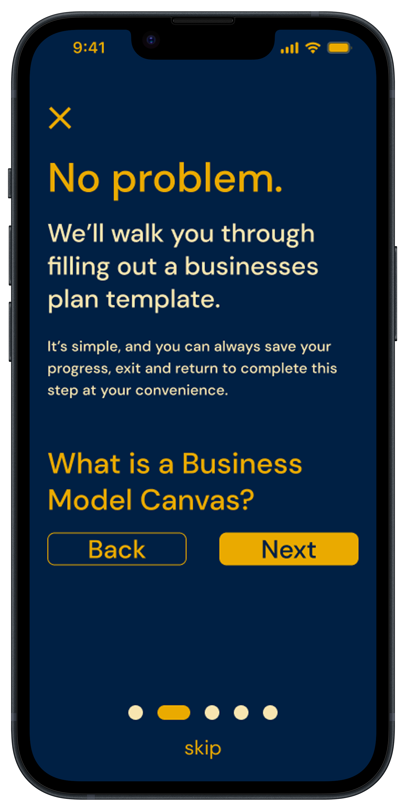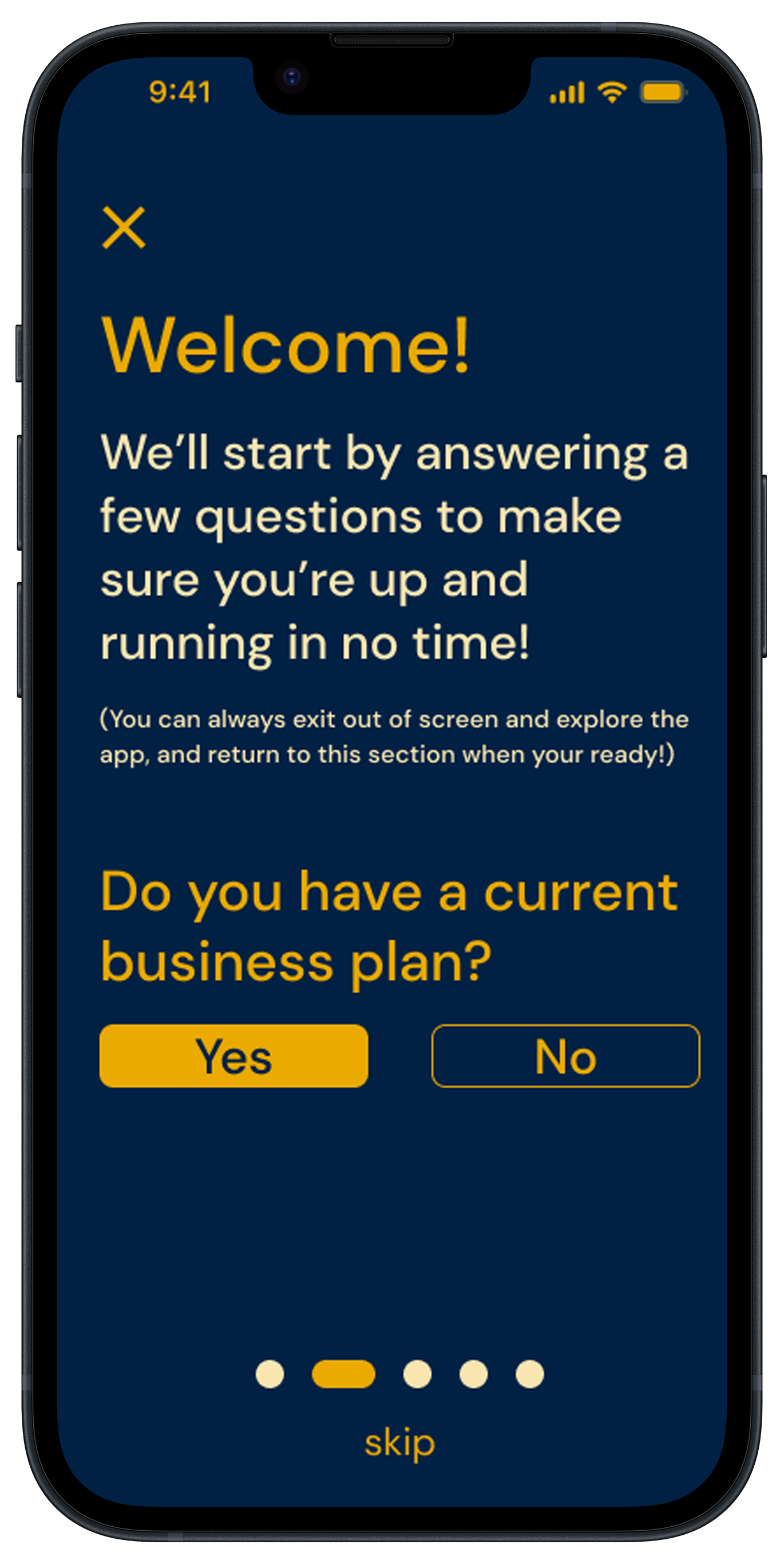 I wanted to design the onboarding process to be as inviting and encouraging to new business owners as possible. I designed the onboarding process to be as educational and informative as possible for new business owners. Once a small business owner has completed the onboarding process they will have a draft of their business plan to start pitching to investors.