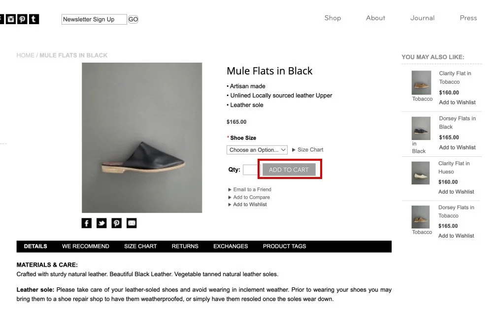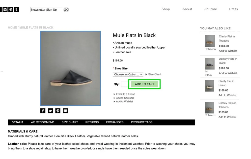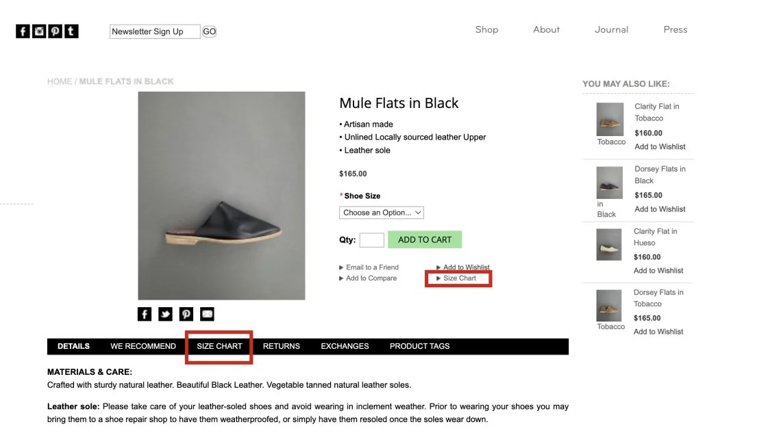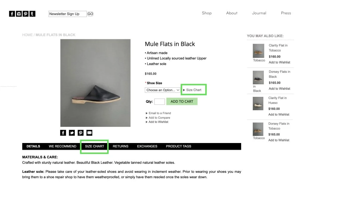 The Size Chart button is a big deal! We found that if our customers could not easily access a size guide or chart, their journey would be more likely to be interrupted.